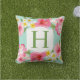 Tropical style pillow design features a pattern of vibrant pink, yellow, and white hibiscus flowers with leaf green monogram letter and seafoam blue / green background color.