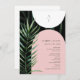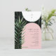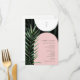 Blush pink and white arches over dark palm leaf background. Vertical monogram at top over white arch. Gray text over pink arch with watercolor palm leaf at left.