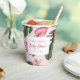 Tropical Baby Shower Paper Cups. Serve your guests in style with our paper cups featuring a tropical pattern background. The lush green palm and monstera leaves, vivid magenta and fuchsia orchids, and delicate blush pink hibiscus flowers add a cohesive and festive flair to your table settings, ensuring every detail is perfectly coordinated.