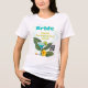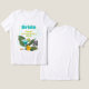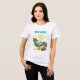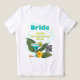 Tropical bachelorette party t-shirt with place for a QR code. The Bride's party tee with drink QR code. A sugar rimmed, blue margarita with lime, and banana leaves is the design. A yellow hibiscus flower and seashells add to the tropical design. Geometric blue and green lines frame two lines of text. "Bride" is in bold aqua blue text. Also add wording such as, "Thanks for buying me a drink" to encourage party guests to splurge for the honoree. Upload the QR code icon where the money donation will go, and be sure to check that it works.