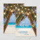 Destination wedding response cards featuring a tropical paradise beach setting with a lush palm tree, your initials engraved in a carved heart and twinkle string lights.