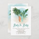 Bring a book! Tropical beach Baby on board surf baby shower bring a book featuring exotic palm trees, bird of paradise watercolor illustration and a destination tropical beach with sand and turquoise blue ocean, with 2 surf boards in brown boho wood and turquoise with a cool font brush script. Perfect for spring and summer baby shower or exotic destination baby showers!