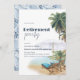 This tropical chic retirement party invitation features a pair of beach/deck chairs on the beach table under the white umbrella with palm trees. The reverse side features geometric patterns in indigo blue. Personalize it for your needs. You can find more matching products at my store.