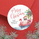 Celebrate the season with this festive and playful round sticker design, perfect for adding a tropical touch to your holiday celebration. The artwork features a laid-back Santa Claus in sunglasses lounging in a pink flamingo floaty, surrounded by ocean waves and beachy vibes—bringing a fun twist to a warm-weather Christmas.