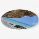 Paper plates with a scenic nature photograph. Beautiful turquoise blue sea with a sandy beach. A big brown rock provides some shade from the bright blue sky.