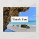 Thank you postcard with a scenic nature photograph. Beautiful turquoise blue sea with a sandy beach. A big brown rock provides some shade from the bright blue sky.