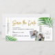 Tropical Beach Wedding Save the Date Boarding Pass with Modern Whimsical Palm Leaf Design and Trendy Script Font features tons of customizable template fields, photos, travel information and a personalized qr code generator on the back of the card.