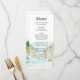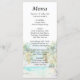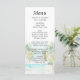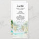 This elegant and beautiful watercolor wedding menu features a beach, blue sky and palm trees. The text combines handwritten script and sans serif fonts for a stylish and modern look. This is perfect for a summer beach or tropical destination wedding.