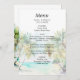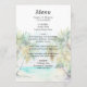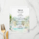 This elegant and beautiful watercolor wedding menu features a beach, blue sky and palm trees. The text combines handwritten script and sans serif fonts for a stylish and modern look. This is perfect for a summer beach or tropical destination wedding.