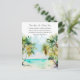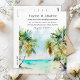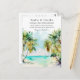 This elegant and beautiful watercolor wedding postcard features a beach, blue sky and palm trees. The text combines handwritten script and sans serif fonts for a stylish and modern look. This is perfect for a summer beach or tropical destination wedding.