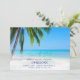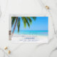 The front of the card features a captivating tropical beach scene, complete with swaying palm trees, powder-white sands, and turquoise waters. It's a picture-perfect representation of the idyllic paradise where your love story will unfold.