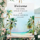This elegant and beautiful watercolor wedding welcome sign features a beach, blue sky and palm trees. The text combines handwritten script and sans serif fonts for a stylish and modern look. This is perfect for a summer beach or tropical destination wedding.