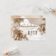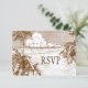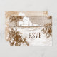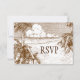 An editable tropical beach etching RSVP card template with script and serif letters on a vintage etching of brown palm trees on a sandy beach and beautiful clouds over calm ocean waves, and space for your response and dates on the reverse.