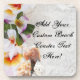 Pretty and light colorful beach watercolor still life scene features close-up of a beach flower lei, with purple, yellow and orange flowers, green leaves, brown and tan sea shells and sand, and white swirls and decorations. A pretty touch for a beach wedding favor, vacation or travel keepsake from a tropical island paradise or just a pretty accessory. All Designs Copyright © 2012 www.CustomInvitesOnline.com