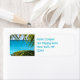 A gorgeous photograph of a tropical beach. The water is crystal clear and azure blue. The image is framed with some sheltering palm fronds. The beach has nice white sand. A very calming relaxing image.