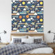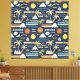Vibrant tropical pattern with suns, waves, palm trees, mountains, and sailboats on a dark background. Perfect for summer designs.