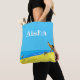 This shoulder tote bag is personalized with your name. It features a digital art photo print of Benaulim Beach in Goa, India. The print is stylised and shows the vast beach in bright yellows against a turquoise blue sea and sky. The prow of a local boat hung with beads is on the right hand side and you can see cows and cyclists on the beach. The main colours are the yellow sand and the bright turquoise blue of the sky. Choose from medium or large sizes.