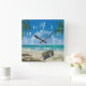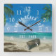 Beach house clock with a tropical scene background. Personalize with family name and established year.