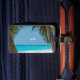 The image adorning these products is of a beautiful tropical beach with white sand, azure blue skies and a turquoise ocean. This is original artwork and was created using chalk, felt tip pens and colored pencils.