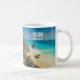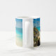 A mug with a beautiful photo featuring Tulum, Mexico. Turquoise waters on a sandy shore. Wind swept palm trees blowing in the breeze near a craggy cliff side. Awesome memento mug.