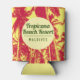 Tropical Beach Resort Can Cooler. Name of the Hotel or Beach Resort, together with its location. Tropical Palm Trees Design Can Cooler in Red and Yellow Colours. Leaf pattern design shows a silhouette effect pattern of leaves. Ideal for beach resort shops or holiday hotel promotions.