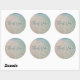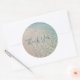 Beach wedding thank you stickers. Water at the shore background, with "thank you" wording in modern script font. Round stickers come in two sizes and can be added to the back of envelopes or put onto favor packaging.
