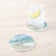 Pretty and elegant ocean beach scene with white sand, clear blue water and a bright blue sky with puffy white clouds. Footprints stroll along the beach shore. Personalize it with your wedding or honeymoon details, or custom names for any occasion.