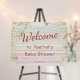 Tropical Beach Seashell Modern Boho Baby Shower Chic Modern Poster Banner Foam Board Party Sign features a pretty beach themed design in pastel colors with seashells and the text "Welcome" in elegant pink calligraphy script typography. Perfect for baby shower party decor. Designed by Evco Studio www.zazzle.com/store/evcostudio