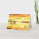 An orange sky, reflected in the water, palms, and a stalk, in sunset shades. Add name to front and message inside. All text can be changed. There is also an additional picture inside, same scene but the bird has flown away.