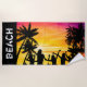 Trendy coastal beach sunset beach towels designed in bold colorful design with palm trees and people celebrating fun at the beach in silhouette. Includes grunge style text that says BEACH in cool lettering style.