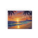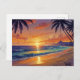 Artwork of a sunset on a tropical beach. Waves and and sand shimmer in the golden glow. There are silhouettes of palm trees.