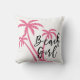 Beach tropical palm tree throw pillow in pink, black, and white with palm trees graphic in the background and stylish and trendy text that says Beach Girl on one side and has a solid color coordinated pink flip side. Designed for ladies or girls as a summer or all year round tropical decor pillow for the home.
