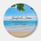 Wedding magnets with a landscape photograph of a tropical beach. Warm sand, azure water and blue sky with tropical leaves along the top.
