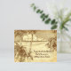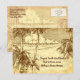 A custom return address postcard with a vintage etching of palm trees on a sandy beach and beautiful clouds over calm ocean waves, on a faux parchment background.