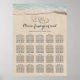 Beach destination wedding table plan featuring a summer tropical beach island background, a vintage sandy beach with two hearts in the shoreline, your initials, and a modern wedding seating chart template of 20 tables.