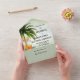 All in one wedding invitation featuring a tropical beach design in pretty green and teal colors. The RSVP part of this invitation has a QR code template to which you can easily add a URL to your own website. Alternately your guests can tear off that part of the invitation to fill out their information and mail it to you. You can also use this area to add information about accommodation or directions if you like.
