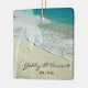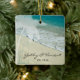Create a keepsake gift for the newlywed bride and groom when you personalize the pretty Tropical Beach Wedding Ornament. This custom beachy marriage ornament features a scenic nature photograph of a turquoise or aqua blue ocean on the white sand shore with a palm tree and swirl design adorning the corner. Perfect to commemorate a casual yet classy island destination or tropics wedding theme.