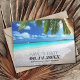 Save the date wedding postcards for your tropical beach destination wedding. Turquoise waters, white sand and palm tree design save the date cards are customized with your wedding details.