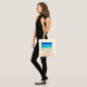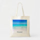 A personalized tote bag with a sandy tropical beach. A gorgeous turquoise sea in the distance and crystal clear waters caressing a sandy beach. A bright blue sky in the background.