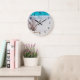 A clock with a gorgeous photograph. Tropical blue water and foamy surf in the background. A collection of seashells and stems set on a white sandy beach.
