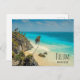 A postcard with a beautiful photo featuring Tulum, Mexico. Turquoise waters on a sandy shore. Wind swept palm trees blowing in the breeze near a craggy cliff side. Soothing and relaxing.