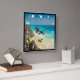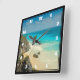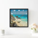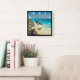 A clock with a beautiful photo featuring Tulum, Mexico. Turquoise waters on a sandy shore. Wind swept palm trees blowing in the breeze near a craggy cliff side. Soothing and relaxing.