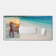 Tropical beach scene desk mat. This large mat makes a nice gift with a big photo on one side and place for the year date. The vertical photo is framed in sea blue with a place for the date in the bottom left corner. The remainder of the mat is and image of blue water and smooth beach sand.