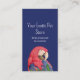 Topical bird pet store blue business card, with a colorful macaw illustration and customizable script lettering. You also add your website to the QR code field for additional marketing. A fun way to add a touch of the jungle to your business marketing.