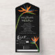 Elegant tropical bird of paradise flowers on a black background accent these tri-fold wedding invitations with your details in chic lettering in sections on the front and back and a detachable RSVP card for guests to complete and return. **REMEMBER to put a stamp on the RSVP card section. MATCHING items in our collection.
