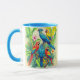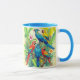 Mug in vividly colored tropical birds surrounded by lush green foliage and vibrant flowers. The birds display brilliant shades of red, blue, yellow, and green. The scene depicts exotic beauty and rich botanical detail.