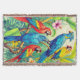 Throw in vividly colored tropical birds surrounded by lush green foliage and vibrant flowers. The birds display brilliant shades of red, blue, yellow, and green. The scene depicts exotic beauty and rich botanical detail.