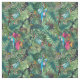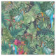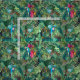 Tropical birds among green plant leaves and interwoven foliage surrounded by flowers with a sunset background