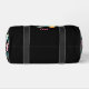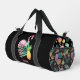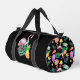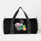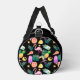 A toucan bird, a pink flamingo, and a bright pineapple combine with an ice cream cone, ice cream bars, a bright grapefruit slice, and a lemon, along with gold stars and green palm leaves to form a fun tropical pattern on this bag. The multi colored, bright images are placed on a dramatic black background on each end. The front and back have images of the flamingo, a palm leaf, and pineapple. Your two letter monogram is in pink on the front. Bright, colorful and fun!