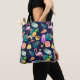 A toucan bird, a pink flamingo, and a bright pineapple combine with an ice cream cone, ice cream bars, a bright grapefruit slice, and a lemon, along with gold stars and green palm leaves to form a fun tropical pattern on this bag. The multi colored, bright images are placed on a navy blue background, and repeated on the back side of the bag. Bright, colorful and fun, no matter where you spend the summer!